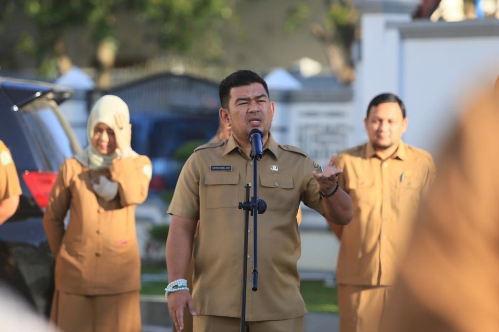 TRIBUNGAYO.COM, BANDA ACEH - Kepala Dinas Kebudayaan dan Pariwisata (Kadisbudpar) Aceh, Almuniza Kamal memimpin apel pagi di area parkir Kantor Disbudpar Aceh, Banda Aceh, Senin (9/1/2023).